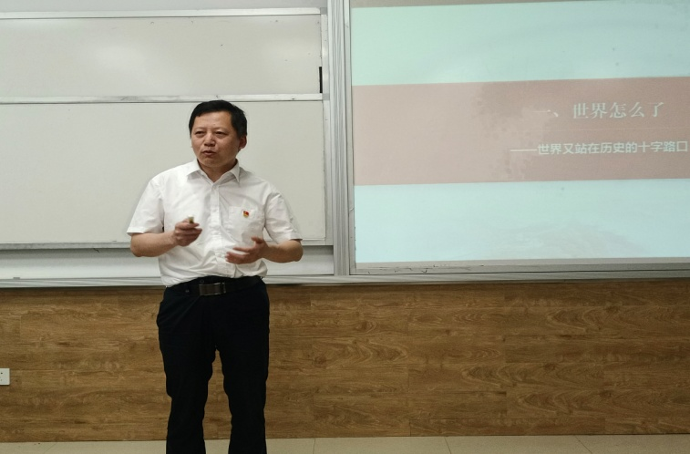 黄志超副董事长以“习近平新时代中国特色社会主义思想--推进构建人类命运共同体”为题,从“世界怎么了”、“人类向何处去”和“中国怎么办”这三个方面带领同学们学习习近平新时代中国特色社会主义思想。