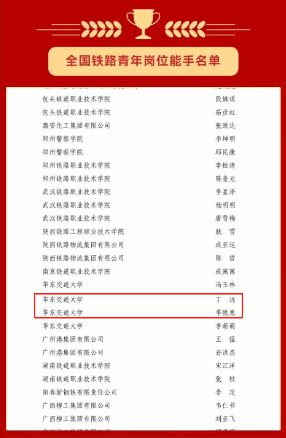 喜报:祝贺公司丁远、季德惠两位老师荣获“全国铁路青年岗位能手”荣誉称号!