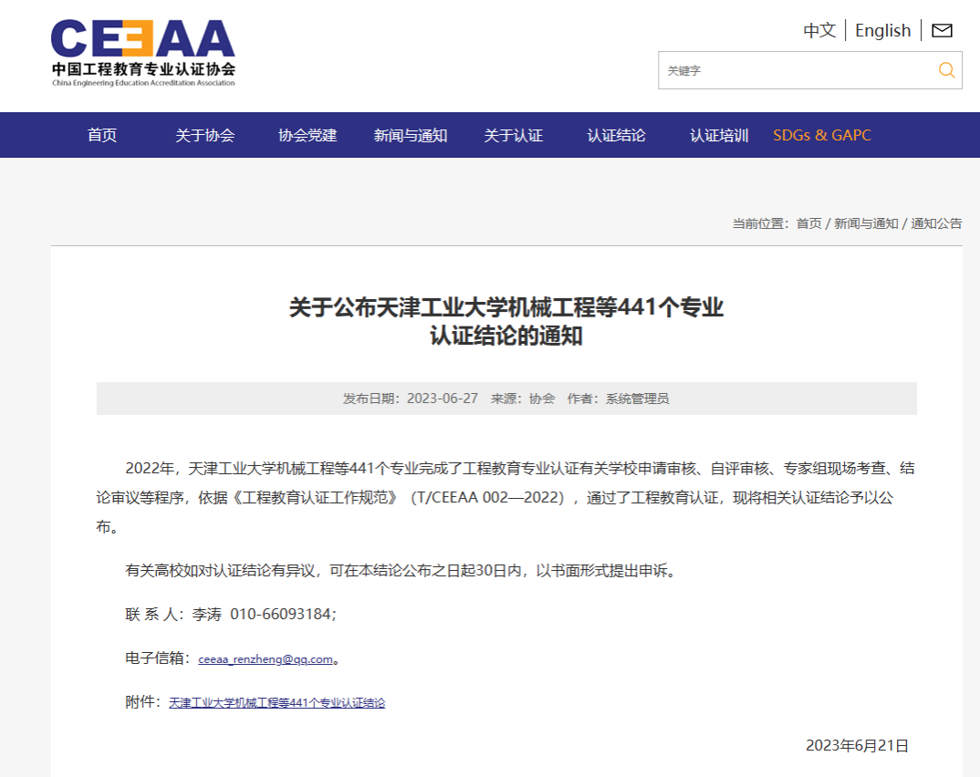 近日,中国工程教育专业认证协会发布了《关于公布天津工业大学机械工程等441个专业认证结论的通知》,经过申请审核、自评审核、专家组现场考查、结论审议等程序,我院材料成型及控制工程、高分子材料与工程2个专业顺利通过认证,有效期为6年(2023年1月至2028年12月)。截至目前,公司2个专业已全部通过工程教育认证。