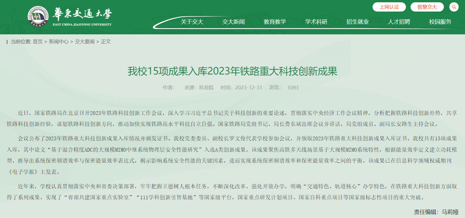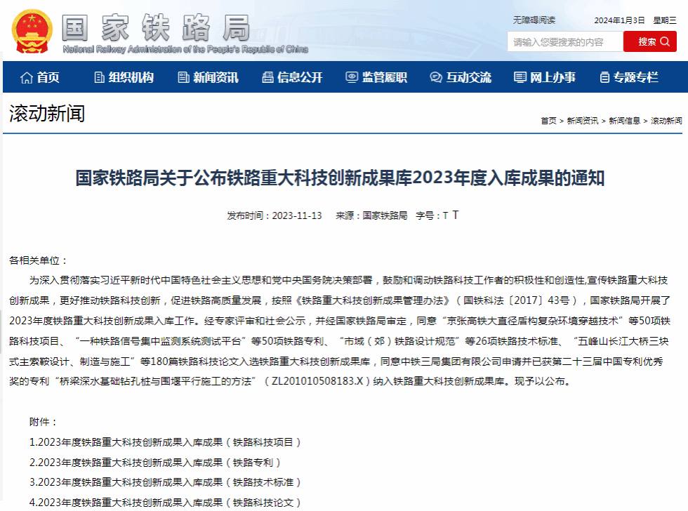 近日,国家铁路局发布了《关于公布铁路重大科技创新成果库2023年度入库成果的通知》,公司沈明学教授团队3项铁路科技论文成果入选重大科技创新成果库。