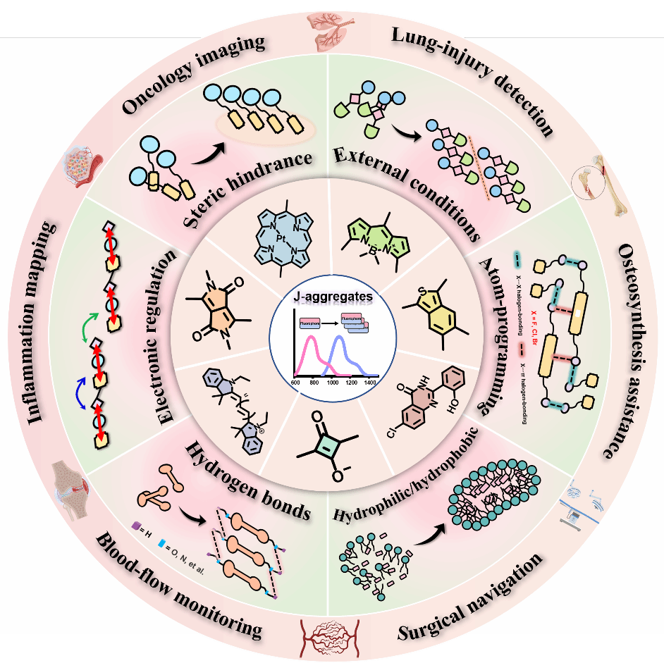 近红外二区(NIR-II,1000-1700 nm)荧光成像由于其高分辨率、低组织自发荧光以及深组织穿透性,在体内深层组织生物成像和高分辨率生物传感方面有着巨大的应用前景。论文总结了近年来报道的NIR-II荧光J聚集体,并详细阐明了如何利用特定的分子结构形成具有J型聚集激子耦合的滑移堆叠堆积基序,来制备高性能NIR-II荧光分子,以进一步促进其生物医学中的应用。