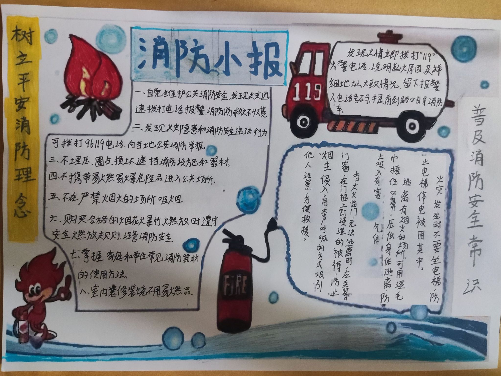 其中较好的手抄报类作品以消防安全为主题,提醒同学们要树立正确的消防意识,普及了消防小常识,寓意深刻、感染力强。作品展示如下。