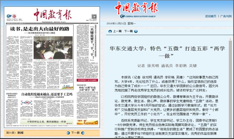 《中国教育报》头版报道学校以“五微”为载体,深入推进员工党员“两学一做”学习教育的主要做法和成效。